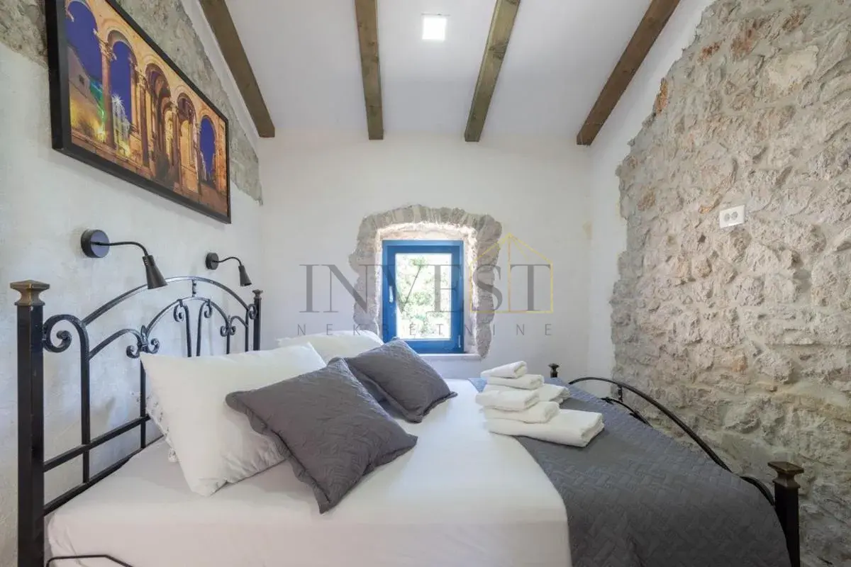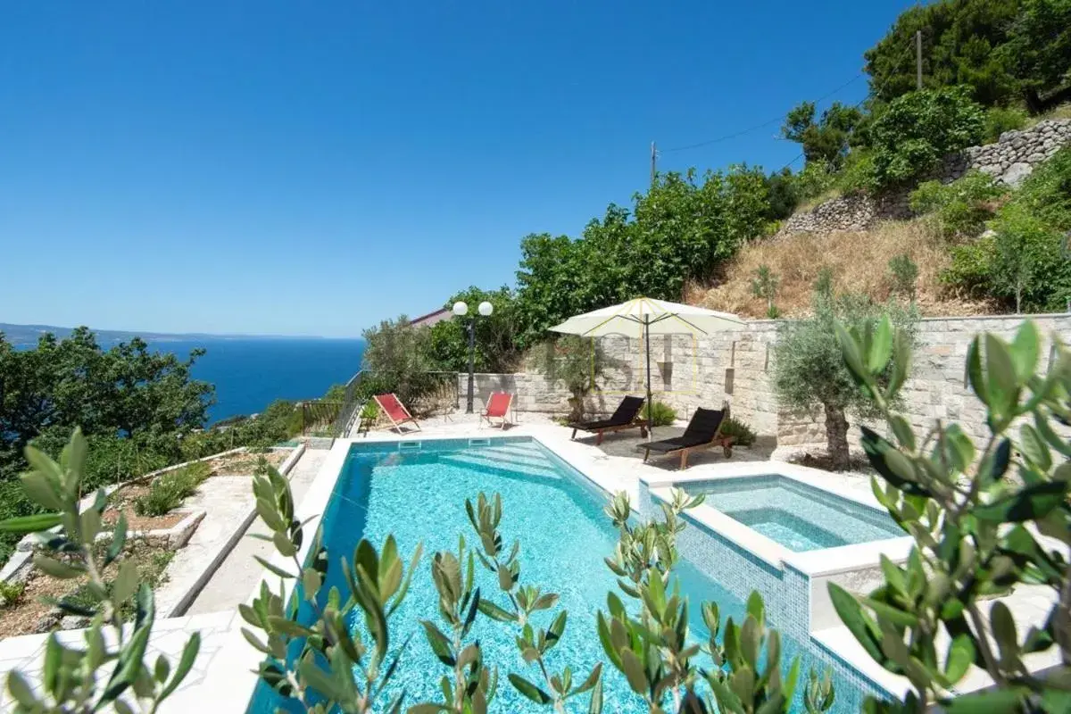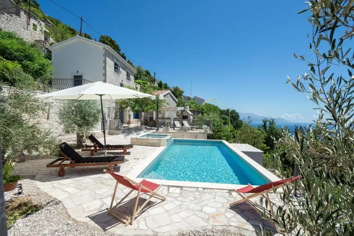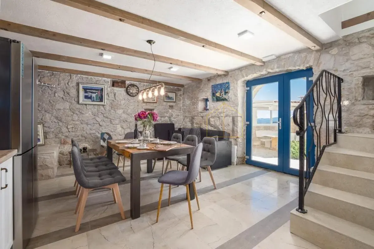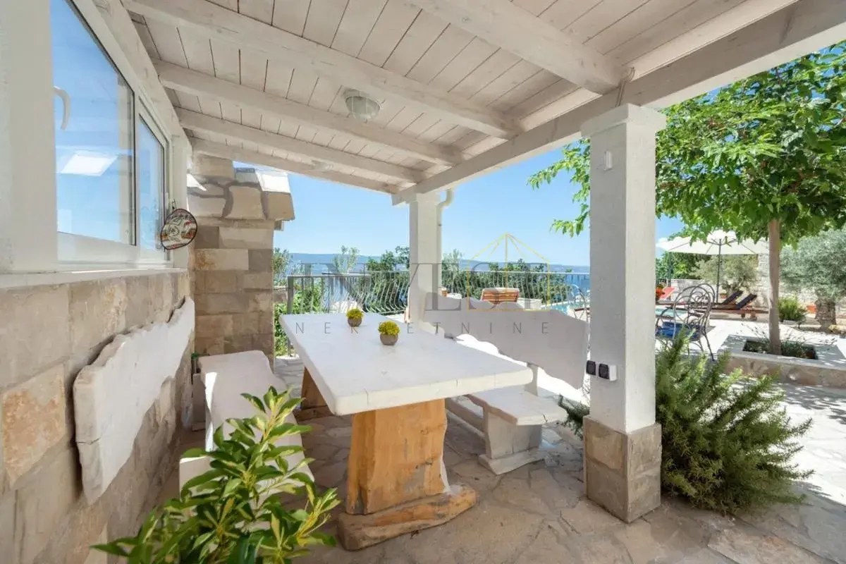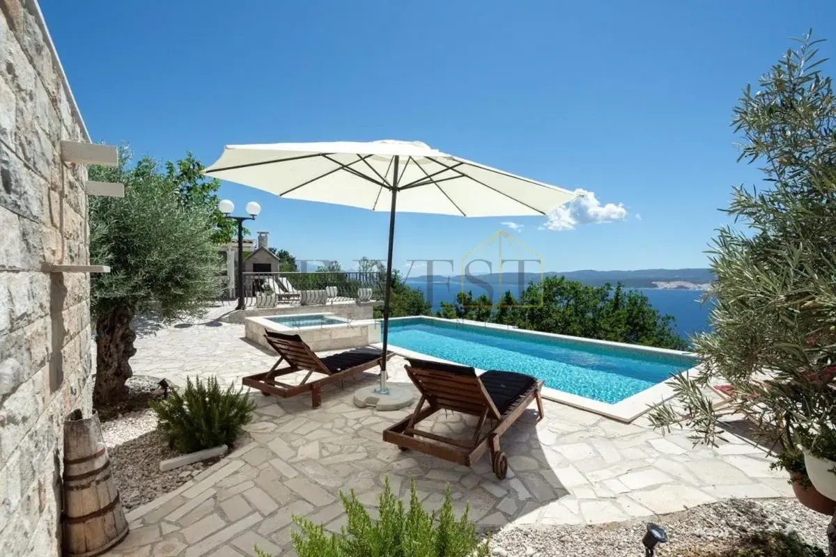 For sale is an exclusive stone villa with a swimming pool and a breathtaking panoramic sea view, located in a quiet and secluded setting that guarantees complete privacy and supreme comfort. This unique property perfectly combines the authentic Mediterranean style of construction with modern luxury, creating an ideal retreat for a vacation or investment in high-class tourism. The villa with a total living area of ​​120 m² is located on a plot of approximately 500 m² and has four bedrooms and three elegantly decorated bathrooms, with a capacity to accommodate up to eight people. The property was completely renovated in 2018, with special attention paid to the quality of materials and functionality of the space. Parking for three cars is also provided. It is designed as two separate residential units, which allows for flexible use – whether for private needs or for tourist rental. The spacious living room naturally continues onto the outdoor space, which is a true oasis of relaxation, with a carefully landscaped yard and numerous amenities to enjoy throughout the year. The outdoor area includes a 28 m² heated swimming pool, a jacuzzi area, a covered terrace and a balcony with an open sea view, as well as a built-in barbecue with a space for socializing. The interior of the villa is further enriched by a fireplace that provides a cozy atmosphere during the winter months, underfloor heating in the bathrooms and air conditioning in all key rooms. The location of the villa is extremely attractive – only 500 meters away from a beautiful beach, while Omiš is 3 km away and Split is 30 km away. There is a restaurant and a shop nearby, while cycling and hiking trails are only 200 meters away. Special advantages of this property include complete privacy, a quiet environment without noise, a spectacular sea view and a combination of traditional stone construction and modern amenities. Thanks to its location and equipment, the villa represents exceptional potential for high-class tourist rental, but also a perfect private oasis for escaping everyday life. For more information and details, feel free to contact us at +385 (0)95 5759 100 (Luka) or luka@investnekretnine.com