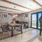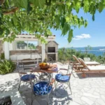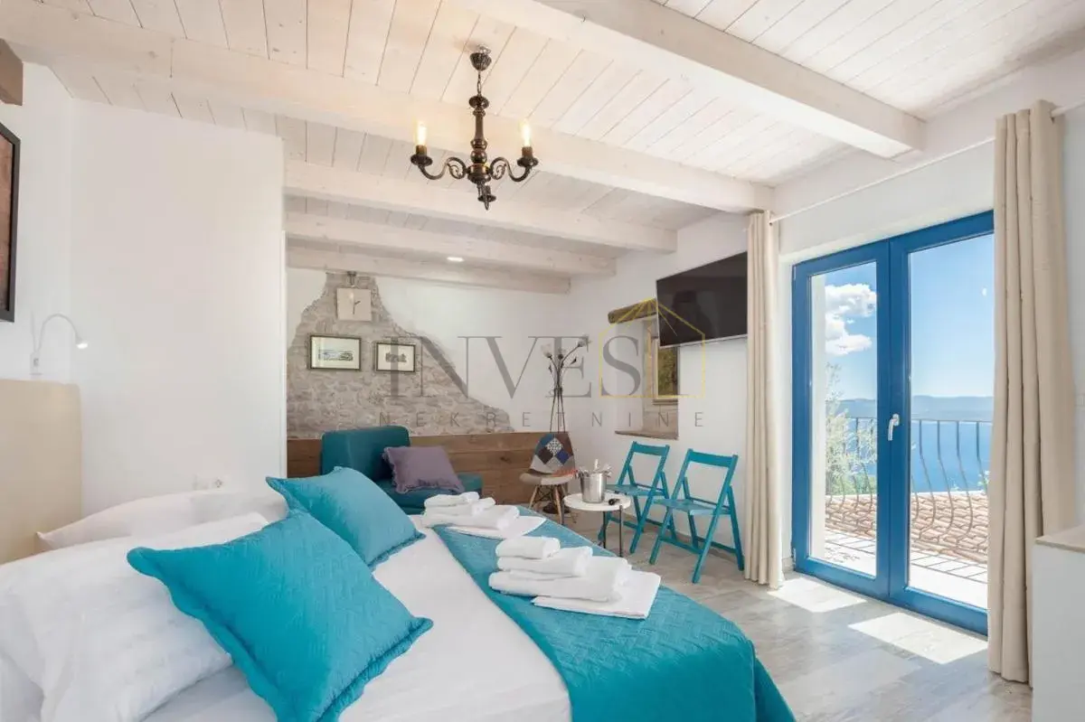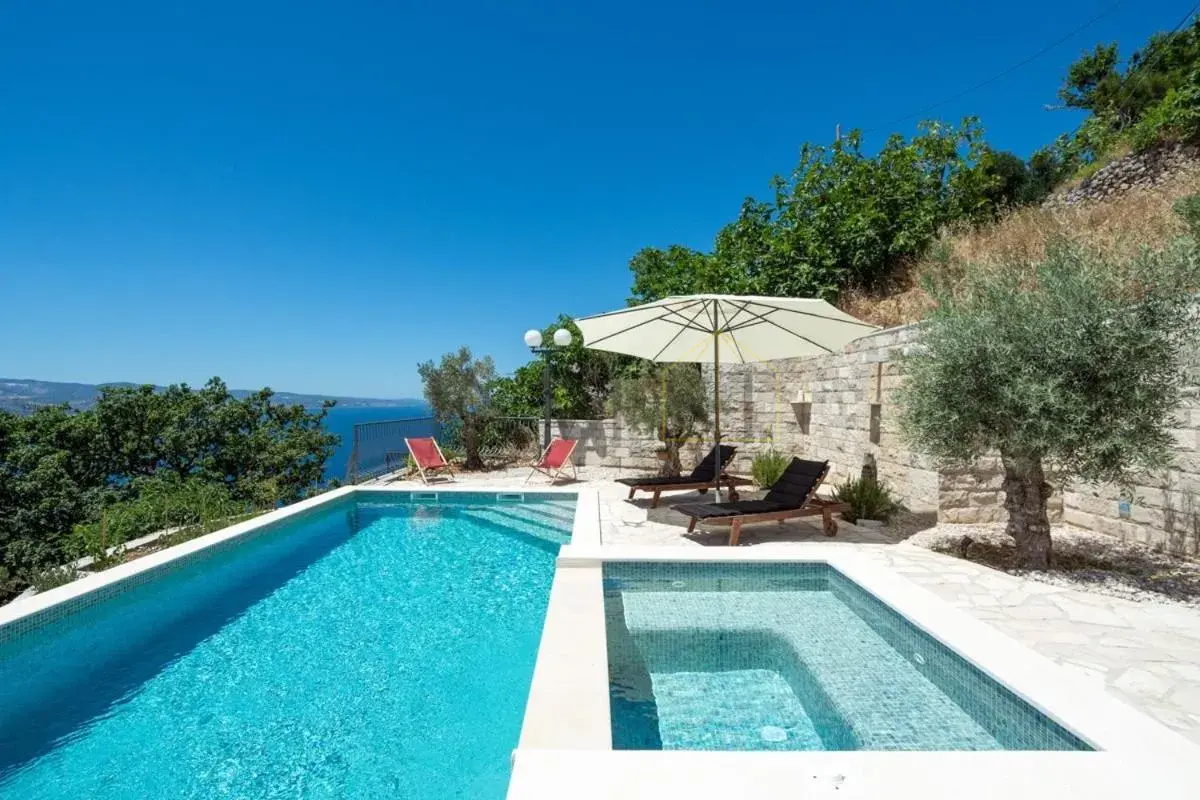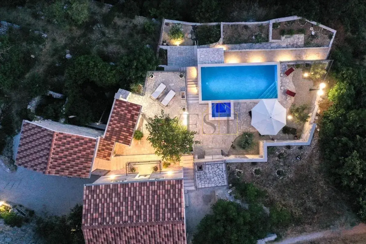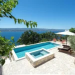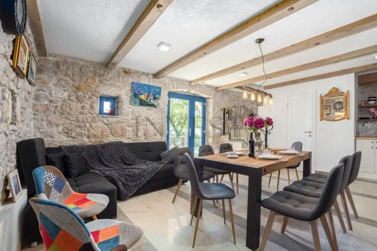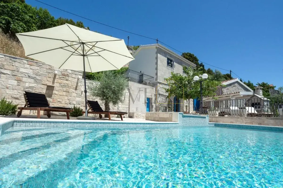 For sale is an exclusive stone villa with a swimming pool and a breathtaking panoramic sea view, located in a quiet and secluded setting that guarantees complete privacy and supreme comfort. This unique property perfectly combines the authentic Mediterranean style of construction with modern luxury, creating an ideal retreat for a vacation or investment in high-class tourism. The villa with a total living area of ​​120 m² is located on a plot of approximately 500 m² and has four bedrooms and three elegantly decorated bathrooms, with a capacity to accommodate up to eight people. The property was completely renovated in 2018, with special attention paid to the quality of materials and functionality of the space. Parking for three cars is also provided. It is designed as two separate residential units, which allows for flexible use – whether for private needs or for tourist rental. The spacious living room naturally continues onto the outdoor space, which is a true oasis of relaxation, with a carefully landscaped yard and numerous amenities to enjoy throughout the year. The outdoor area includes a 28 m² heated swimming pool, a jacuzzi area, a covered terrace and a balcony with an open sea view, as well as a built-in barbecue with a space for socializing. The interior of the villa is further enriched by a fireplace that provides a cozy atmosphere during the winter months, underfloor heating in the bathrooms and air conditioning in all key rooms. The location of the villa is extremely attractive – only 500 meters away from a beautiful beach, while Omiš is 3 km away and Split is 30 km away. There is a restaurant and a shop nearby, while cycling and hiking trails are only 200 meters away. Special advantages of this property include complete privacy, a quiet environment without noise, a spectacular sea view and a combination of traditional stone construction and modern amenities. Thanks to its location and equipment, the villa represents exceptional potential for high-class tourist rental, but also a perfect private oasis for escaping everyday life. For more information and details, feel free to contact us at +385 (0)95 5759 100 (Luka) or luka@investnekretnine.com