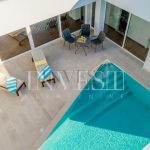 Located on a plot of 956 m2. It is located in a quiet, maximally intimate architectural environment. It consists of the main living area, which has an extension to the central courtyard with a swimming pool, and also opens to the northern courtyard with a summer kitchen, and various contents of the garden. Open concept kitchen with dining room, Four bedrooms are oriented to the east and use their part of the garden, while their hallway is oriented to the atrium, which ensures intimacy and quick access from the central area. The fifth bedroom is located next to the garage in the north wing of the house, and is oriented towards the central atrium with the swimming pool. The yard was designed as a micro-urbanism of concrete plateaus, which accommodate different contents. It consists of a couple of zones, a carefully landscaped area with Mediterranean plants, a rest area and a barbecue, a swimming pool with a sunbathing area, a basketball court, billiards and a driveway with parking for cars. On the north side, there is enough space to park 3 cars and a garage.