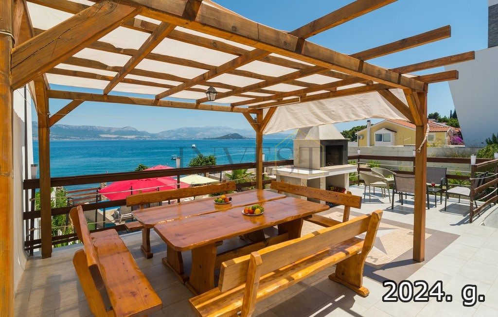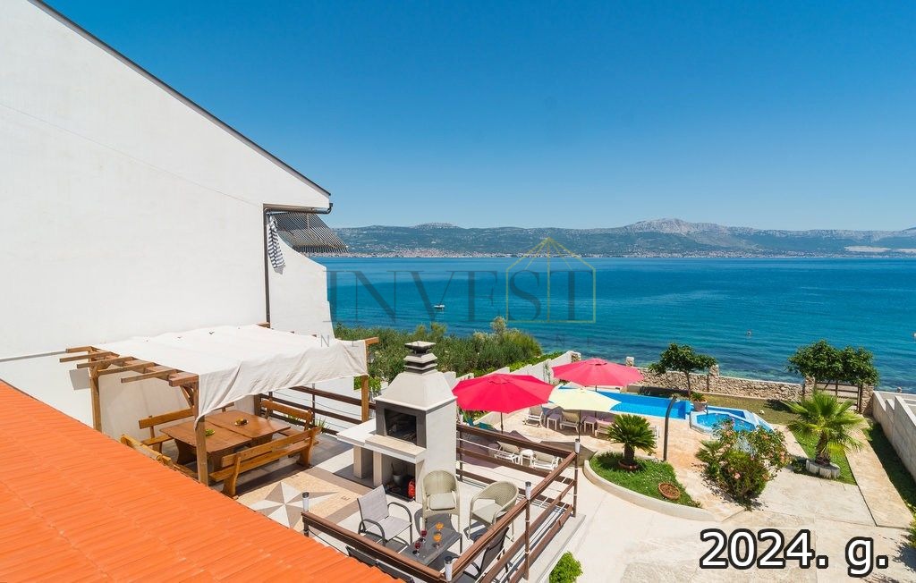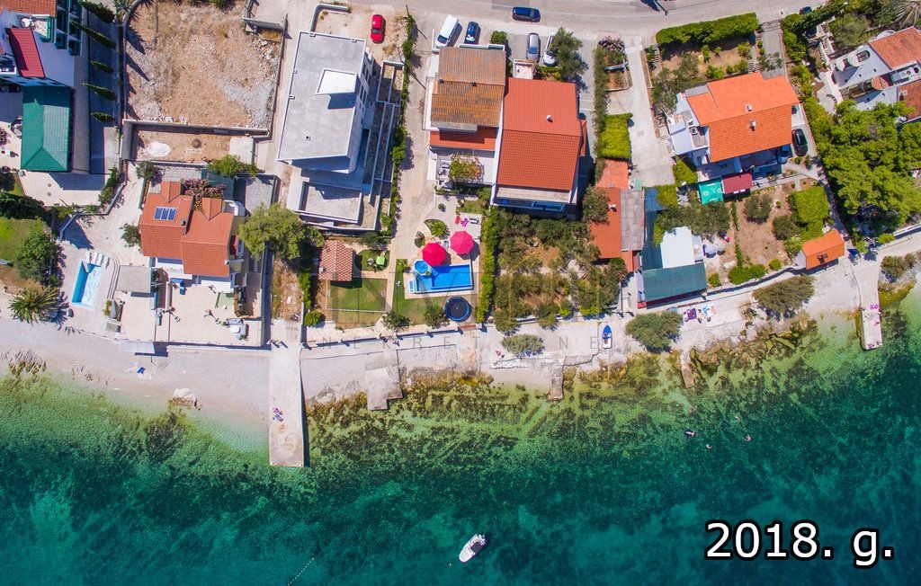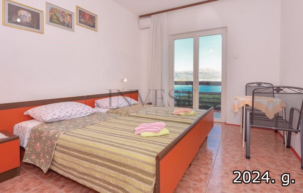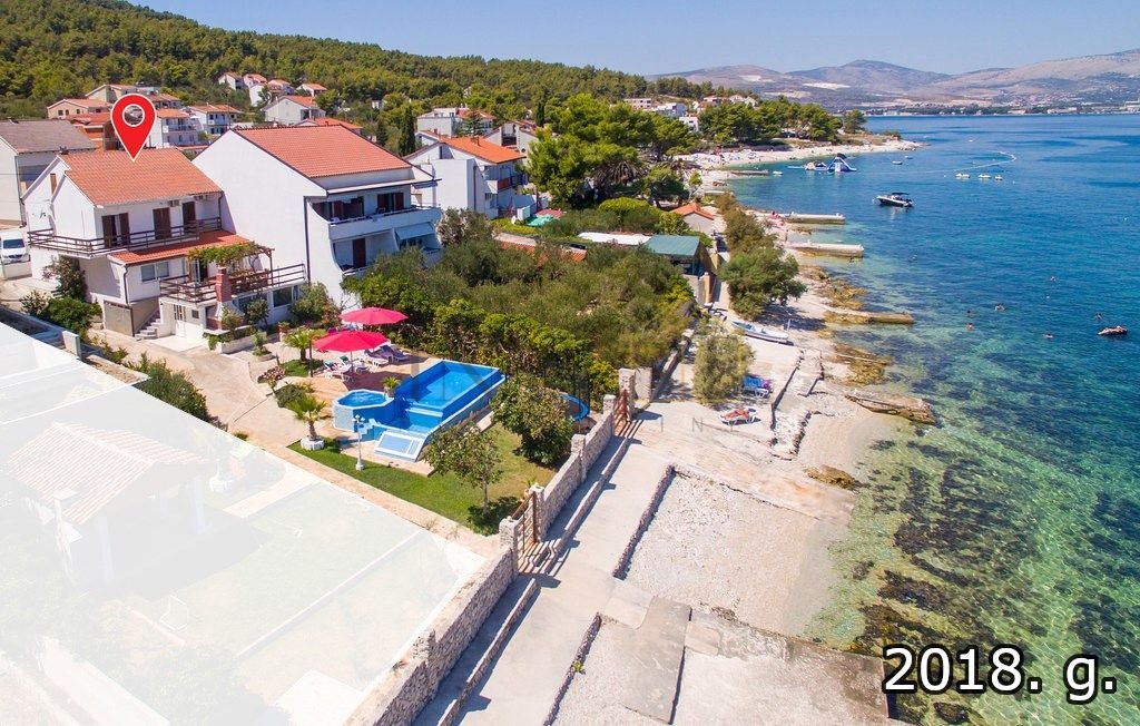 Jedinstvena prilika za kupnju kuće u Slatinama na otoku Čiovu, s izravnim pristupom šljunčanoj plaži direktno iz prostranog dvorišta. Kuća se prostire na zemljištu od 800 m², s 260 m² stambenog prostora, uključujući prostrane terase, pet spavaćih soba i jedan apartman. Ukupno ima 12 kreveta, dodatnih 6 u apartmanu, četiri kupaonice, dvije kuhinje te blagovaonicu za 12 osoba.