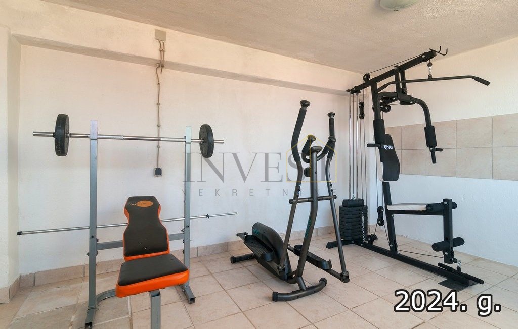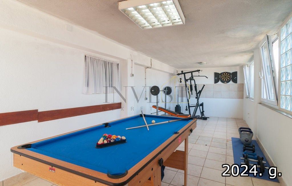 Nekretnina ima parking za više od osam vozila, garažu i podrum od 80 m², kao i teretanu (30 m²). Dvorište je opremljeno bazenom (30 m²) s grijanim whirlpoolom, prostorom za djecu, travnjacima te betonskom površinom za smještaj brodice. Kuća je izgrađena 1981. godine i redovito renovirana, uključujući nove PVC prozore, sanitarne čvorove, garažna vrata i kapije. Opremljena je s 6 klima uređaja, optičkim internetom i satelitskom TV, te dva dimnjaka za grijanje putem kamina ili peći na drva.