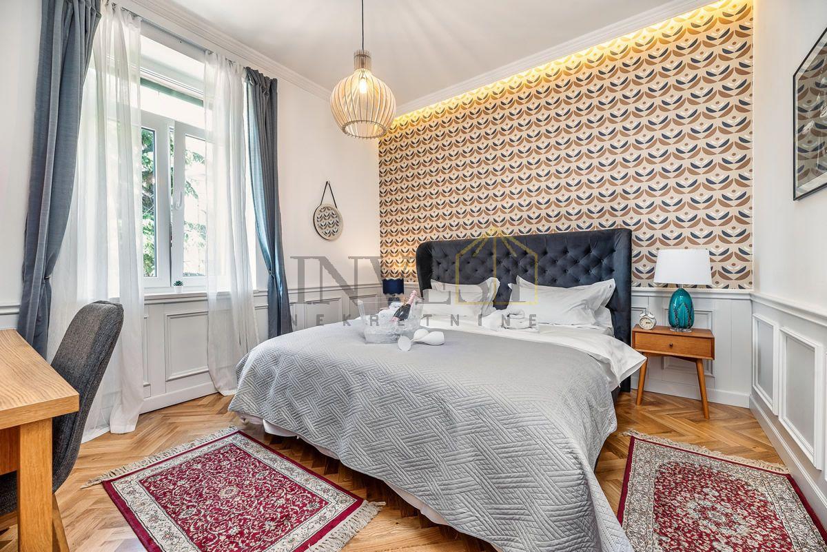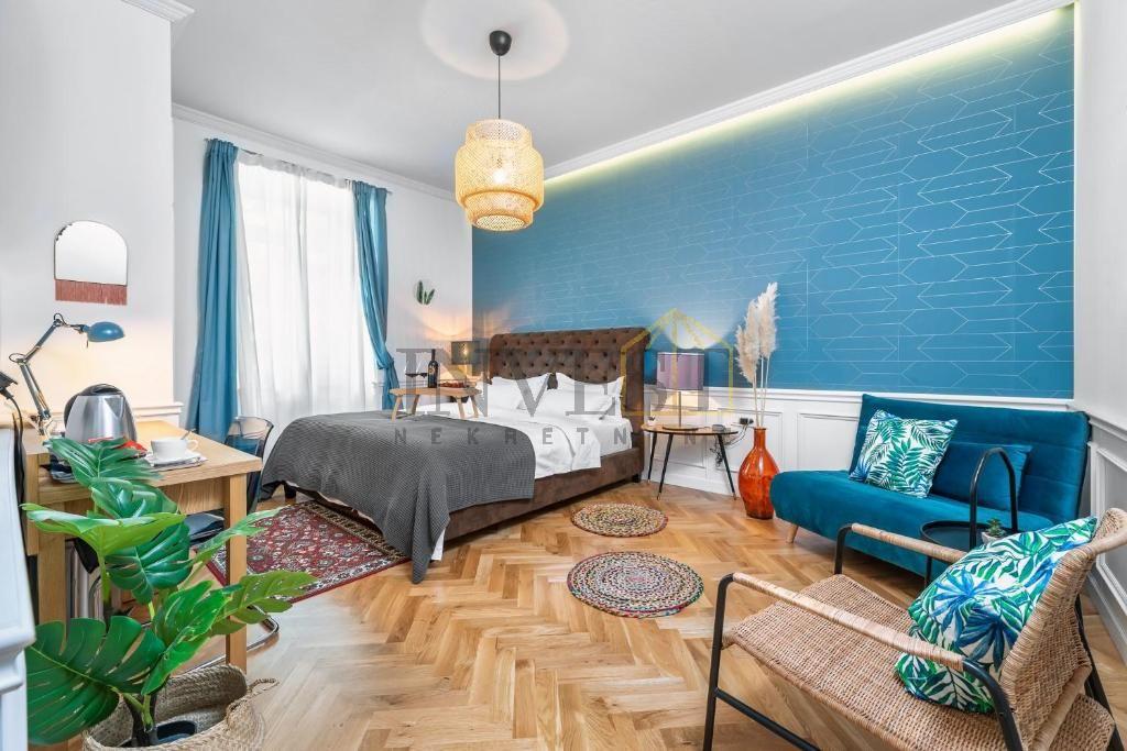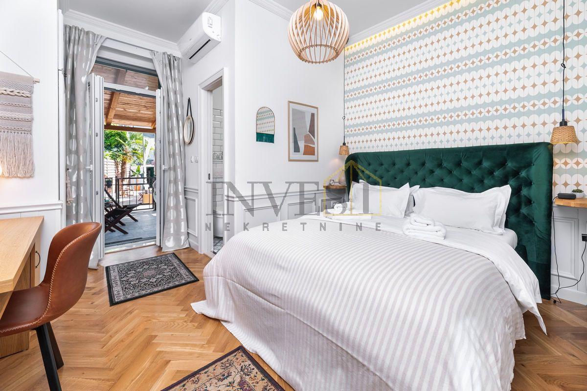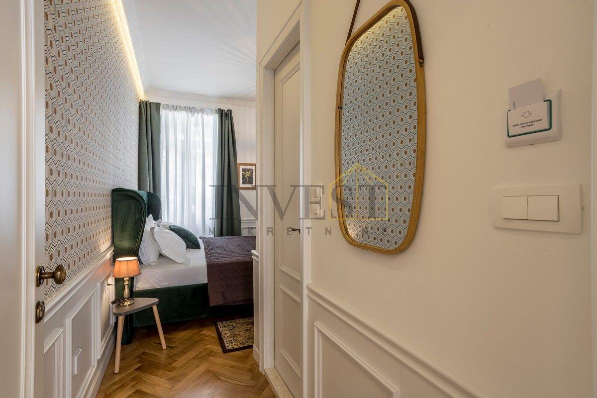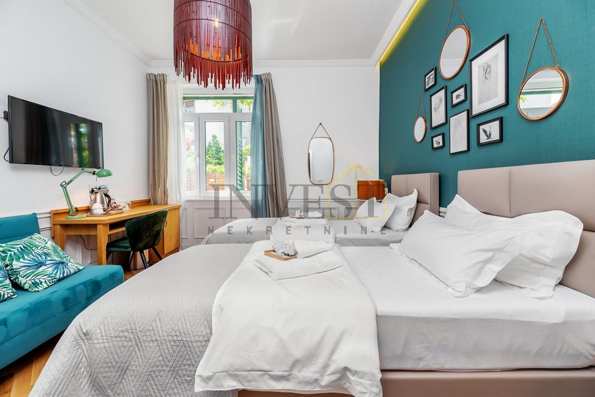 Posredujemo u prodaji ove izuzetne nekretnine. Nalazi se u samom centru grada površine 152 m2 s okućnicom od 400 m2. Stan koji je položen na prvom katu sastoji se od 6 predivno uređenih soba, svaka sa svojom vlastitom kupaonicom. Prostor je potpuno opremljen te uređen s puno stila, ukusa, promišljajući o svakom detalju i sadržaju. Sve sobe su povezane hodnikom iz kojeg se direktno izlazi na terasu i prostor za uživanje i relaksaciju koji čini bazen, jacuzzi, sunčalište, pomoćni objekt s čajnom kuhinjom, praonom, mini skladište…te vrta s mediteranskim biljem. Nekretnina je u funkciji turizma, uhodanog i organiziranog posla koji donosi izvanredne prihode, te budućem vlasniku pruža sigurnost poslovanja. Objekt se prodaje kompletno opremljen svim uređajima, tehnikom i namještajem. Boravak u ovom objektu pruža mir i relaksaciju, dostupnost svih sadžaja u samom centru grada. Cijena dostupna na upit. Razgled ove nekretnine moguće je uz potpis Ugovora o posredovanju, u svrhu zaštite vlasnika nekretnine od posjeta neregistriranih osoba, a u sladu sa Zakonom o zaštiti podataka i Zakonom o posredovanju u prometu nekretnina. Sve informacije, kao i dogovor za razgled ovog stana, molimo na kontakt broj: 095 3972341 (Meri)