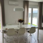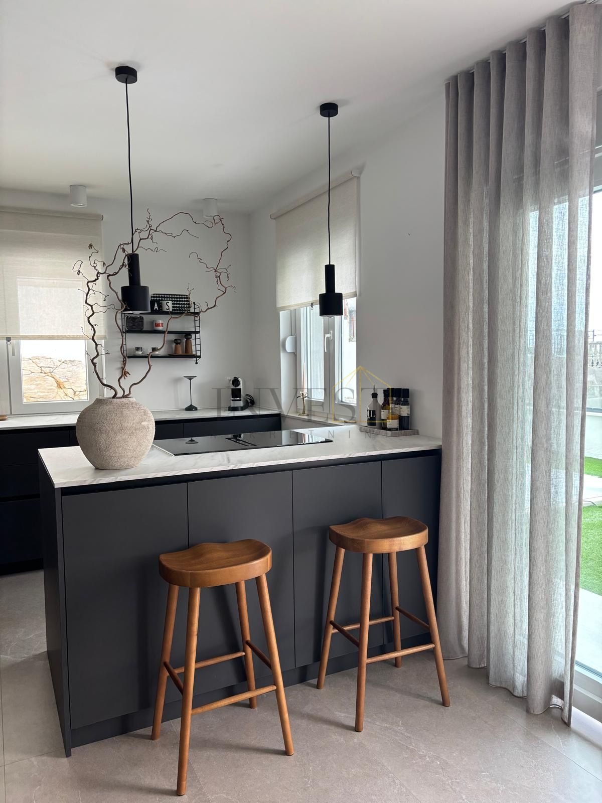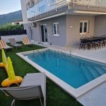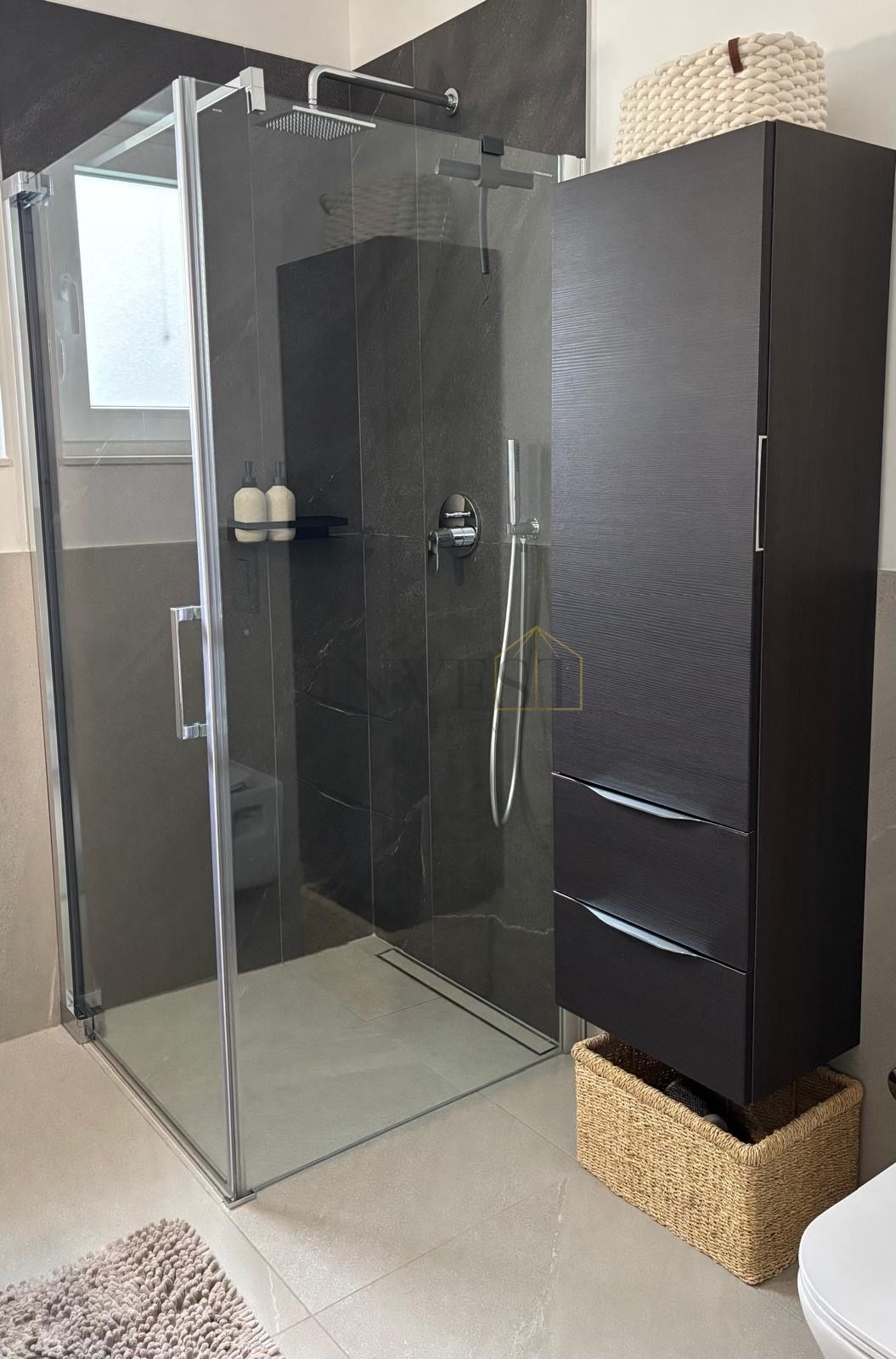Sastoji se od tri spavaće sobe, kupaonice, toaleta, hodnika, prostranog dnevnog boravaka iz kojeg se izlazi na terasu i dvorište s bazenom te potpuno opremljenu kuhinju. Terasa s pogledom na more opremljena je prostorom za sjedenje, sunčalištem, tušem…