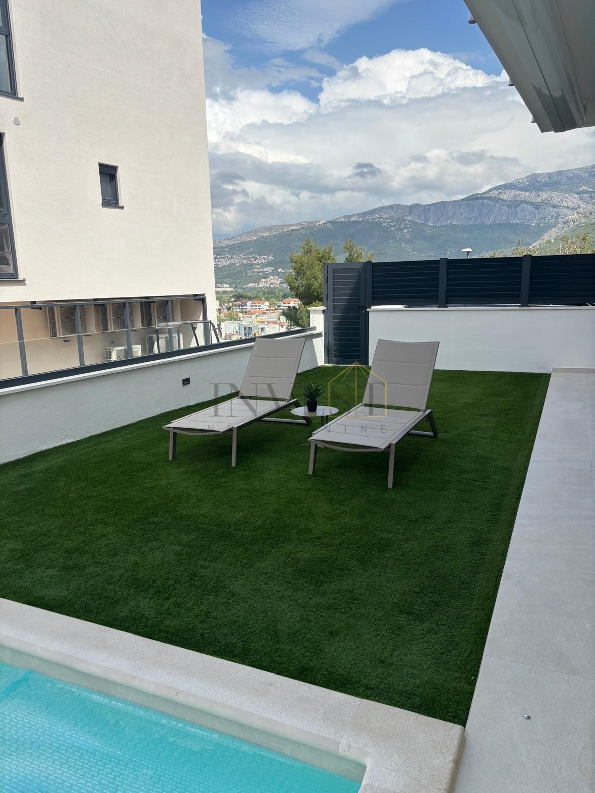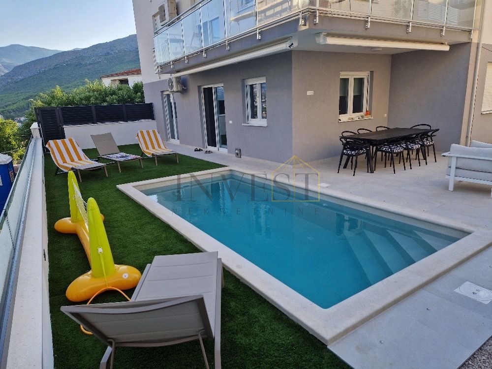 Posredujemo u prodaji potpuno moderno namještenog stana ukupne neto površine 126 m², smještenog u prizemlju male stambene zgrade novije gradnje sa svega tri stana. Stan se nalazi u Strožancu, nadomak Splita. Zapadne orijentacije s velikim privatnim dvorištem površine 197 m2 sa bazenom.